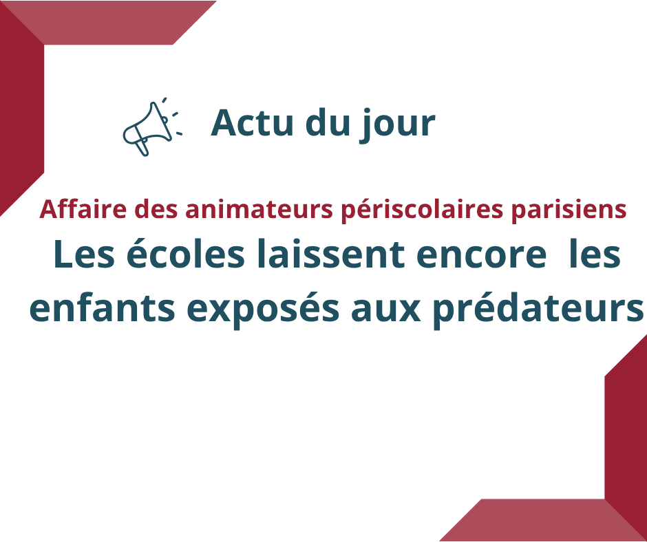 Affaire des animateurs prédateurs du périscolaire parisien : L’école laisse  les enfants entre les mains d’agresseurs sexuels . Une nouvelle affaire éclate encore à Paris des animateurs agresseurs sexuels . Ces animateurs du périscolaire sont aujourd’hui mis en cause pour des faits d’une gravité extrême visant de très jeunes enfants. Ce n’est pas une affaire […]